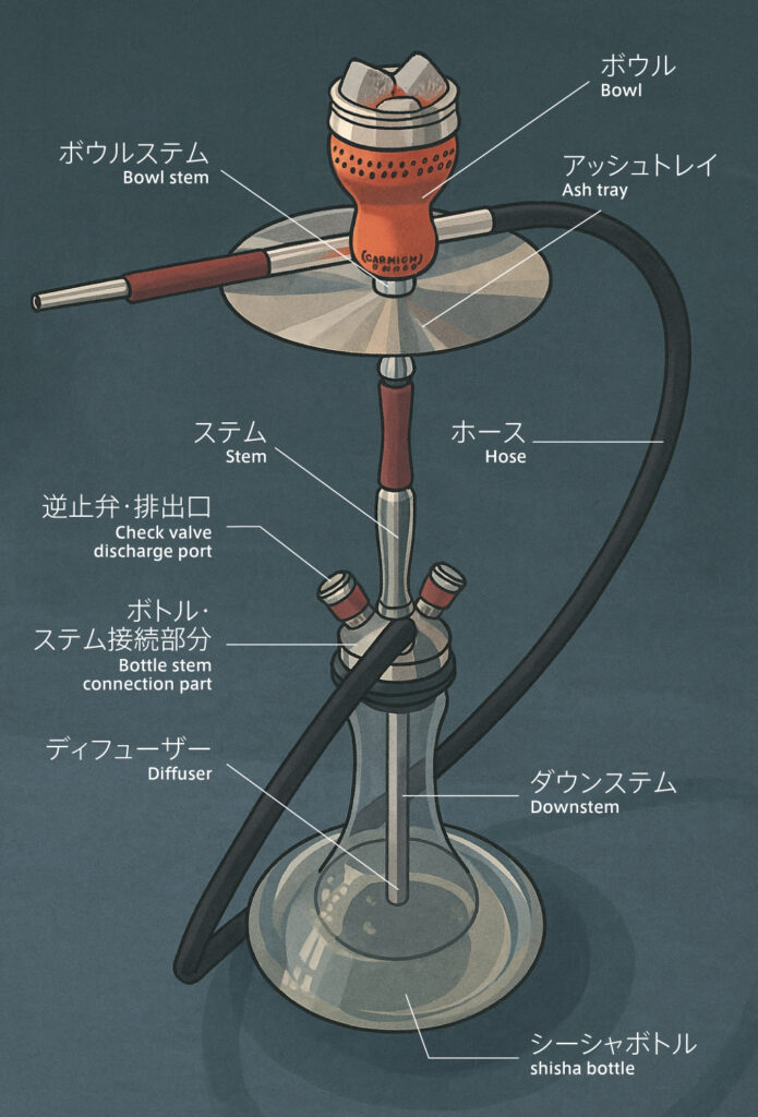 構造としては、上部に「フレーバーを入れるボウル(ハガル)」があり、その上に炭を置いて加熱します。発生した煙はステム(パイプ)を通って下部のボトルに届き、ホースを通じて口元へ運ばれます。吸い込む力でボトル内の煙が循環し、吸いやすくなるという流れです。